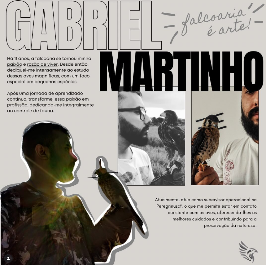 Há 11 anos a falcoaria se tornou minha paixão e razão de viver. Dediquei-me intensamente ao estudo das aves, com foco especial em pequenas espécies. Hoje atuo como supervisor operacional na Peregrinus, em contato diário com as aves e com o controle de fauna profissional.