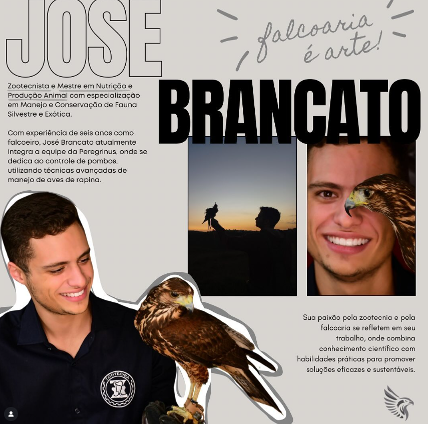 Sou Zootecnista e Mestre em Nutrição e Produção Animal, com especialização em Manejo e Conservação de Fauna Silvestre e Exótica. Há seis anos trabalho como falcoeiro e hoje faço parte da equipe Peregrinus, onde atuo diariamente no controle de pombos com técnicas avançadas de manejo de aves de rapina.